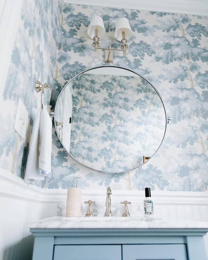 Give your small bathroom a fresh and airy update by hanging a soft blue tree pattern wallpaper above classic white wainscoting. Mount a large round mirror directly on the beautifully decorated wall to reflect light and make the tight space feel much bigger. Complete this relaxing look by choosing a vanity cabinet painted in a matching shade of light blue with shiny silver hardware.