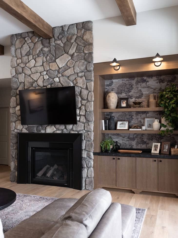 Transform plain wooden shelving units by applying a dark landscape wallpaper directly to the back wall behind your display items. This creative addition brings instant depth to the room and pairs perfectly with a heavy stone fireplace next to it. Complete the cozy styling by arranging trailing green plants and textured ceramic vases on the wooden boards.