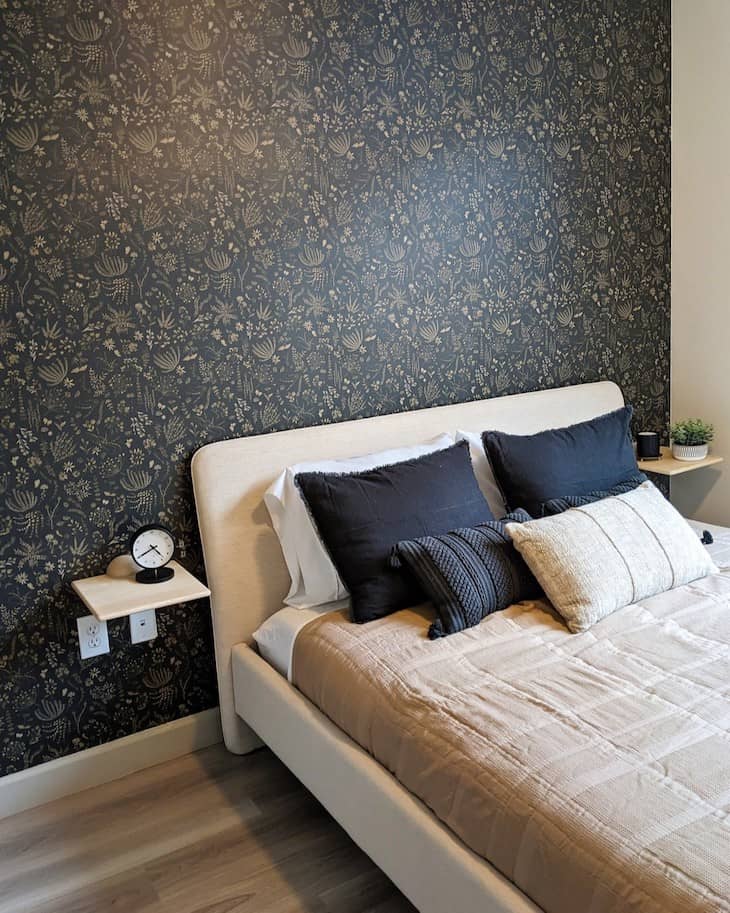 Choose a dark floral wallpaper to create a cozy and relaxing accent wall right behind your bed. Contrast the deep colors of the wall pattern by using a light cream upholstered bed frame and neutral soft bedding. Mount simple floating wooden nightstands directly onto the beautifully patterned surface to save floor space and keep a clean modern look.