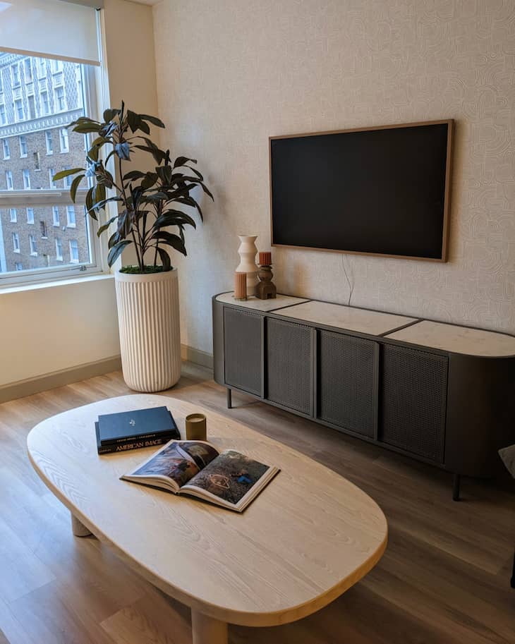 Apply a light wallpaper with a gentle curved pattern behind your television to soften the look of a modern beige living room. Mount a sleek screen directly onto the newly decorated wall to build a clean and organized entertainment area. Ground the space by placing a dark media console underneath and adding a tall green plant in the corner.