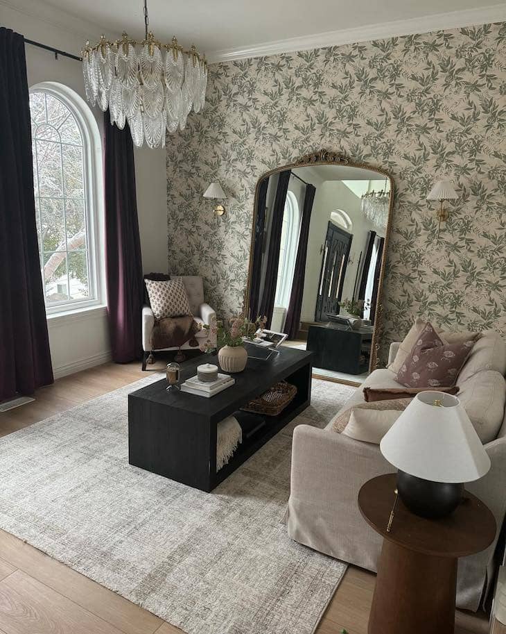 Covering your main wall with a green botanical wallpaper is a wonderful way to bring a sense of nature and elegance into your space. To make the room feel even larger, try leaning a massive gold floor mirror directly against the beautifully patterned surface. Finish the sophisticated design by hanging dark curtains and adding a solid black coffee table to perfectly contrast with your light beige living room furniture.