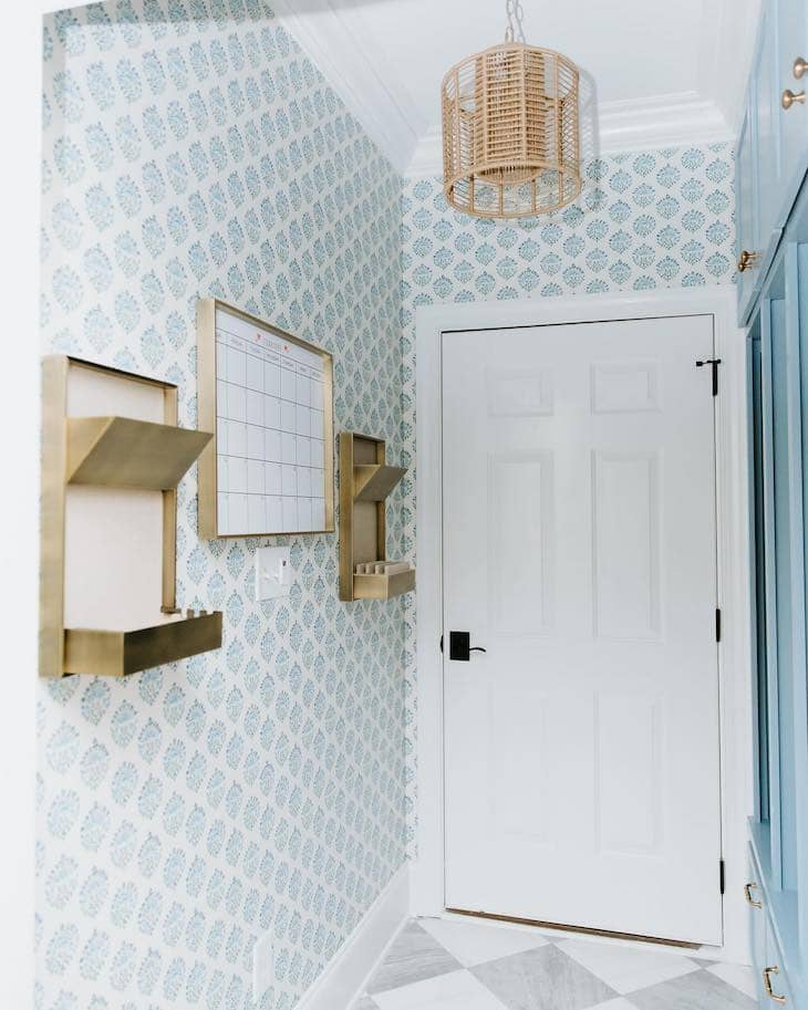 Liven up a small utility space like a mudroom by covering the walls in a cheerful blue and white repeating wallpaper. Mount sleek brass organizers and a framed calendar directly onto the pattern to create a stylish and functional family command center. Complete this fresh look by painting your storage cabinets a matching shade of blue and hanging a natural woven light fixture from the ceiling.