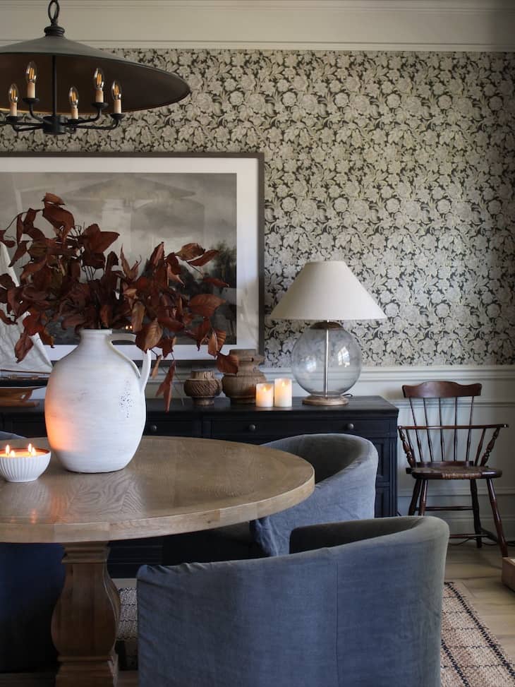 Bring warmth to your eating area by hanging a highly textured floral wallpaper above a low white wall trim. Anchor the busy pattern with a solid black sideboard and a rustic round wooden table surrounded by comfortable grey chairs. Complete this cozy atmosphere by displaying a large framed print and a heavy white vase filled with dried brown leaves.