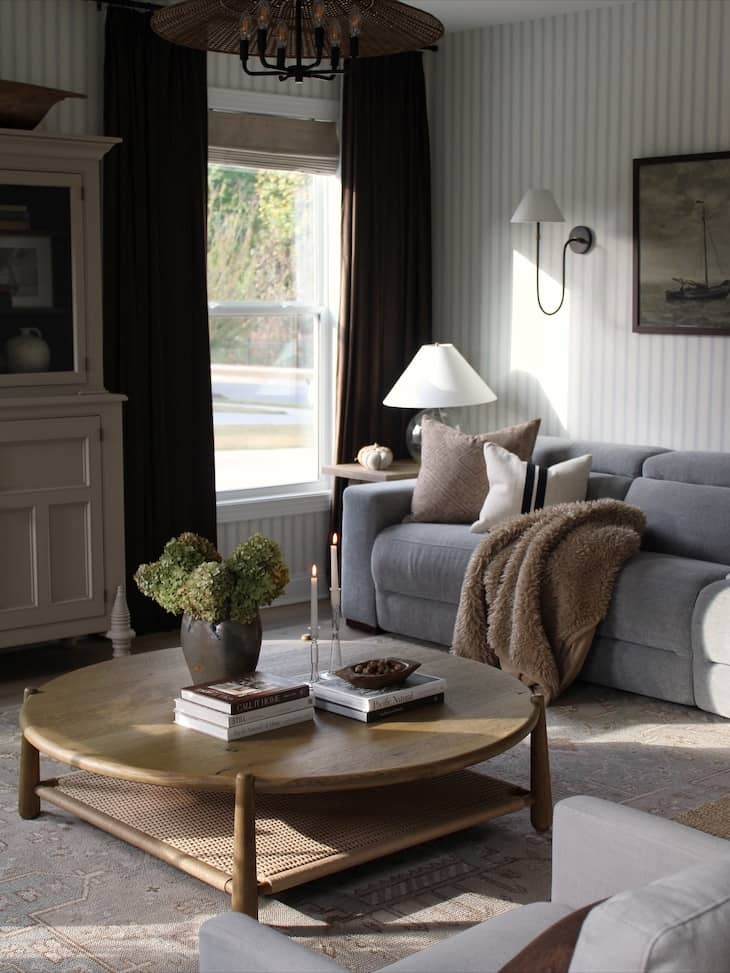 Apply a gentle vertically striped wallpaper to instantly make your living room walls appear much higher and more elegant. Ground this light and airy space by framing the bright window with heavy dark brown curtains and adding a comfortable grey sofa. Finish the relaxing design by centering a large round wooden coffee table decorated with stacked books and fresh greenery.