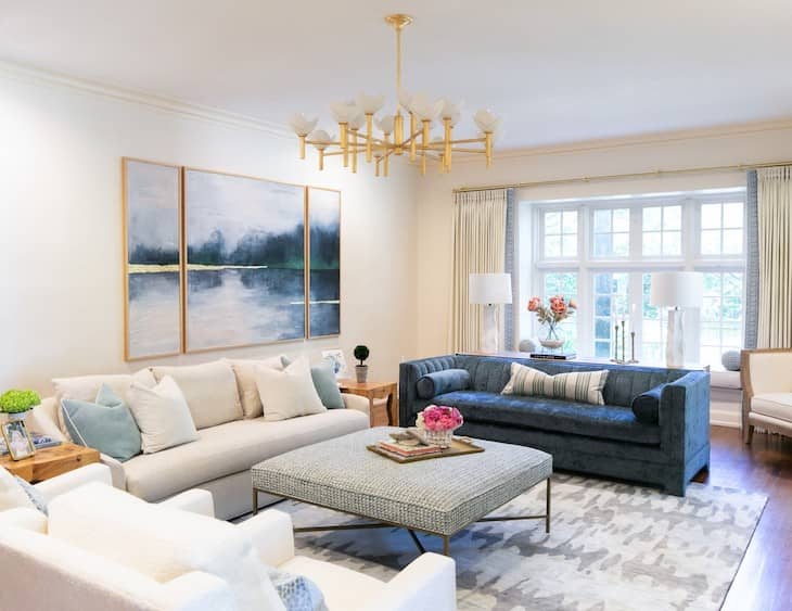 Start by choosing a deep blue sofa as the main statement piece in the room. Balance the bold color with soft neutrals like a white sofa, cream chairs, and light-colored walls to keep the space bright and inviting. Finish the look with a textured ottoman, subtle patterned rug, and artwork that ties blue and neutral tones together for a cohesive design.