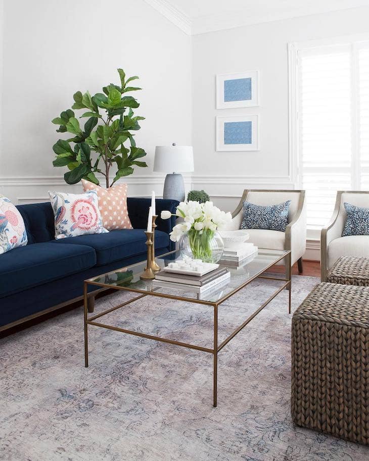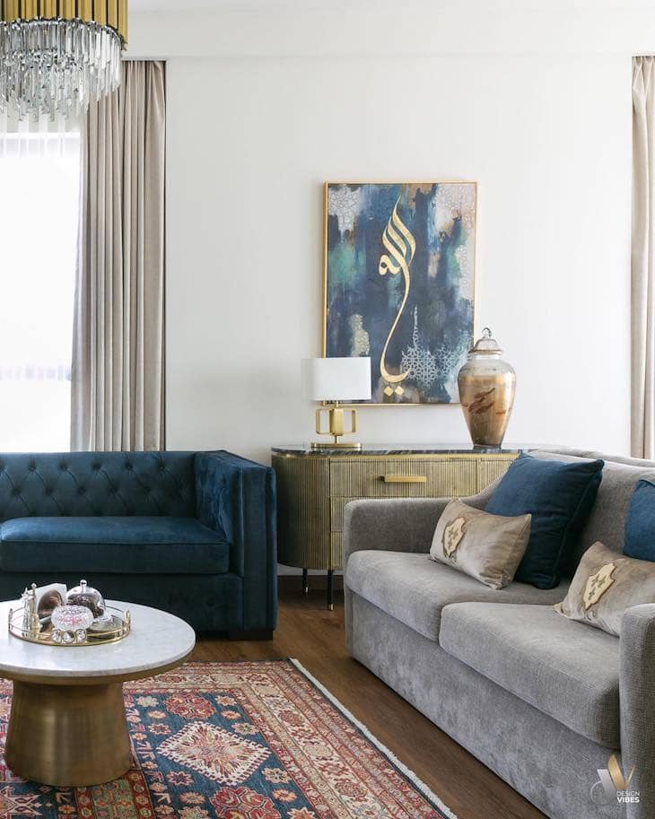 Create a rich and sophisticated look by pairing a deep blue sofa or armchair with warm metallic accents. Gold elements, like a console table, lamp, or decor tray, instantly elevate the space and add a touch of elegance. Balance the bold tones with a soft neutral sofa and a patterned rug to keep the room feeling warm and inviting.