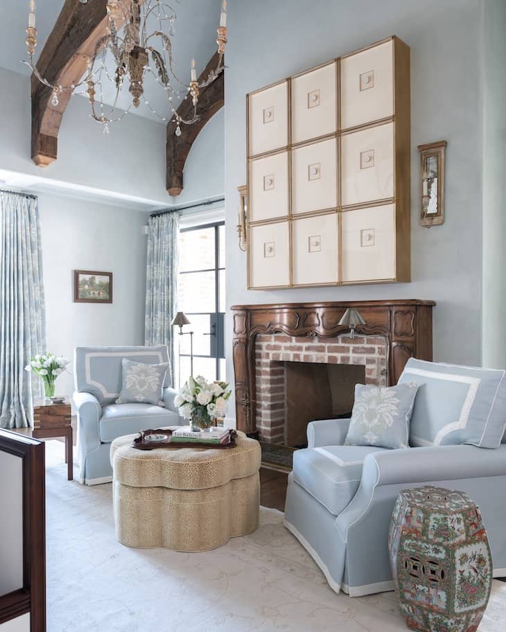 You can create a very elegant and classic look by pairing light powder-blue armchairs with a traditional wood-carved fireplace. To make the room feel more cohesive, hang long curtains that match the soft blue shade of your seating and wall color. Finally, placing a unique scalloped ottoman in the center of the room adds a fun shape that balances the formal architectural details like the dark wood ceiling beams.