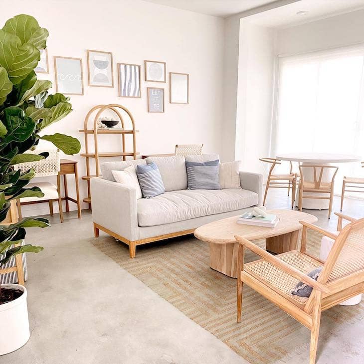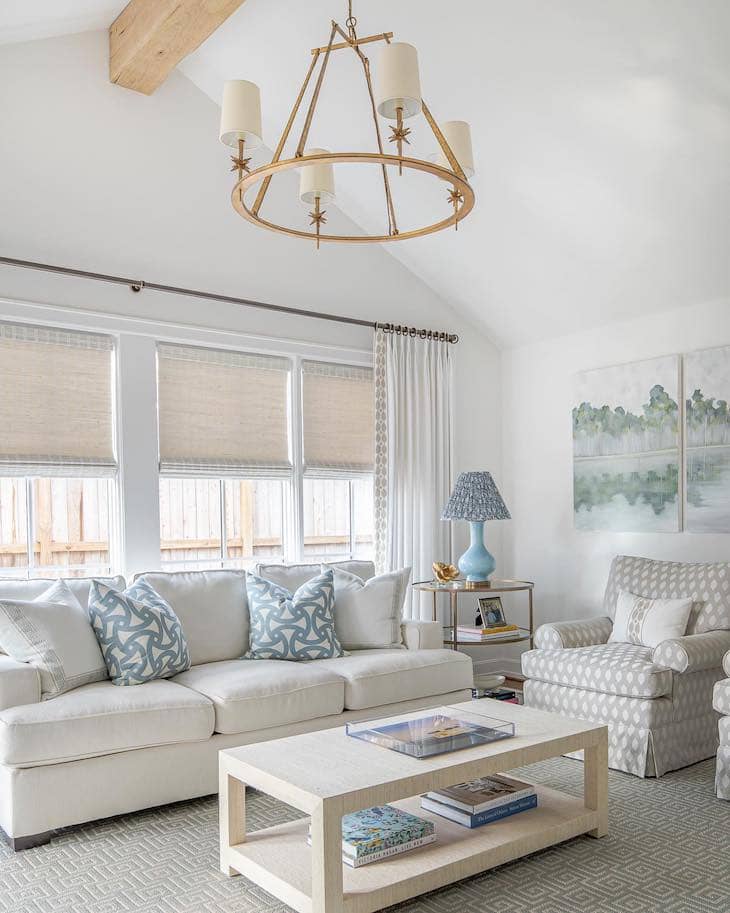 Add a soft touch of blue through pillows and decor to keep a neutral living room feeling fresh and airy. Pair the cool tones with warm wood furniture to create a space that feels both calm and inviting. Keep the styling simple with a clean-lined coffee table, white flowers, and layered neutrals for a timeless look.