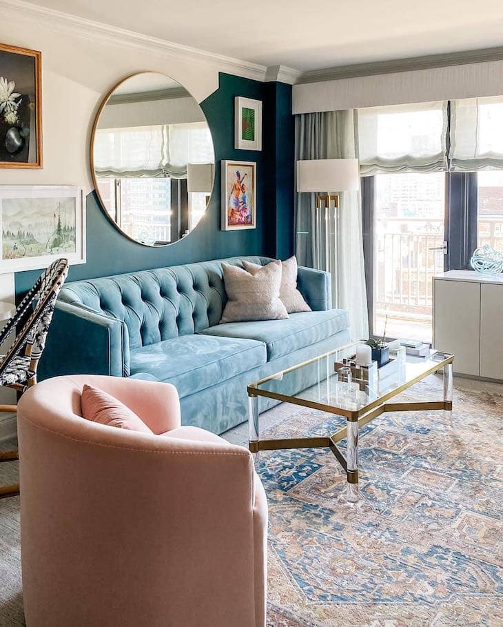 Make a strong statement by painting the walls in a deep blue shade to add depth and drama. Soften the look with a lighter blue velvet sofa that keeps the space feeling elegant and inviting. Layer in warm accents like gold details, a patterned rug, and a blush chair to create contrast and visual balance.