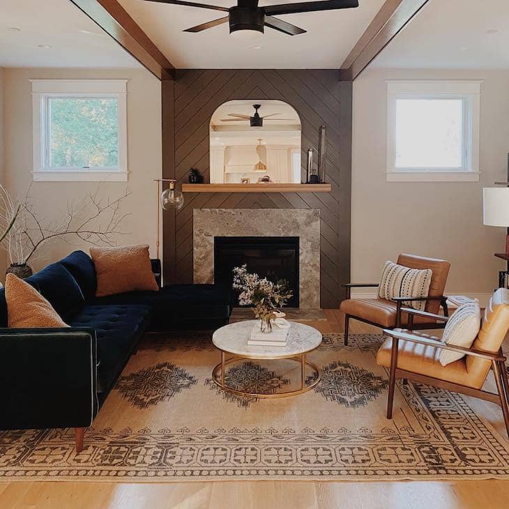 Set the tone with a deep blue sofa to create a cozy and dramatic focal point. Pair it with warm leather chairs and wood accents to keep the space feeling rich and inviting. Complete the design with a patterned rug and a simple round coffee table for a balanced, modern look.