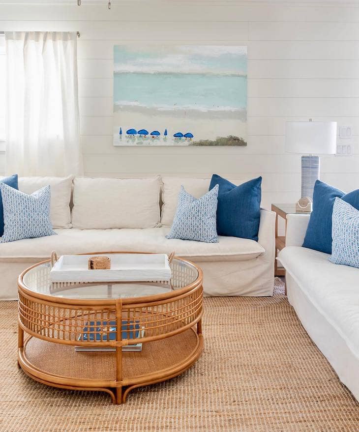 Bring a relaxed coastal feel into your living room by adding blue accent pillows to a neutral sofa. Pair the soft blue tones with natural textures like a woven coffee table and a jute rug for warmth and depth. Complete the look with light artwork and simple decor to keep the space airy and fresh.