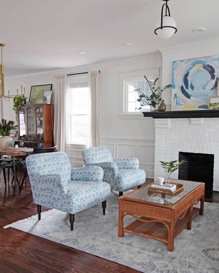 You can instantly liven up a white living room by placing a pair of matching light blue patterned armchairs in the center of the space. To help the color pop, position these chairs on a faded blue area rug that echoes the patterns without competing for attention. Above the white brick fireplace, hanging a piece of abstract art with bold blue swirls will tie all the different tones together for a perfectly coordinated look.