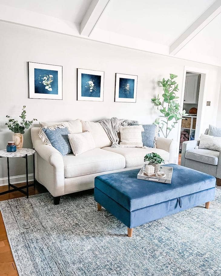 Use a bold blue ottoman to create a functional and eye-catching focal point. Pair it with a neutral sofa and soft blue pillows to keep the color palette cohesive and calm. Complete the look with simple artwork and a textured rug that subtly repeats the blue tones throughout the space.