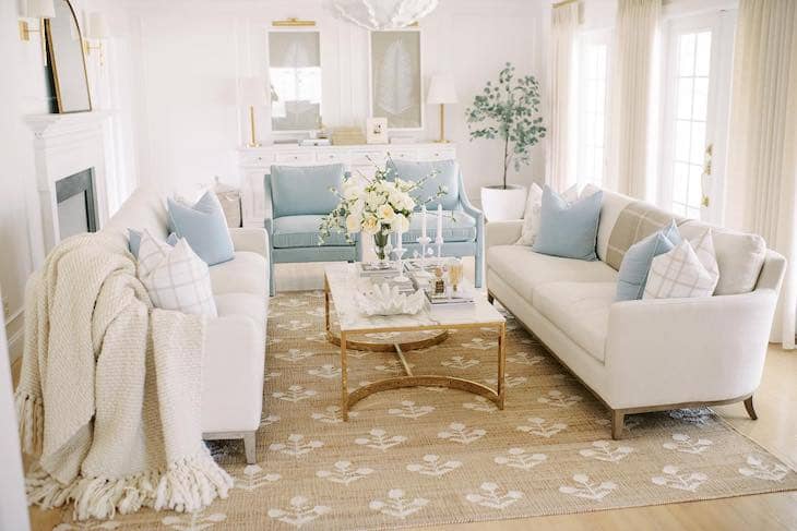 Create a light and elegant space by layering soft blue pillows onto neutral sofas. Pair the gentle blue tones with white walls and warm metallic details for a fresh, polished look. Keep the room feeling open and calm by using minimal decor and a natural textured rug.