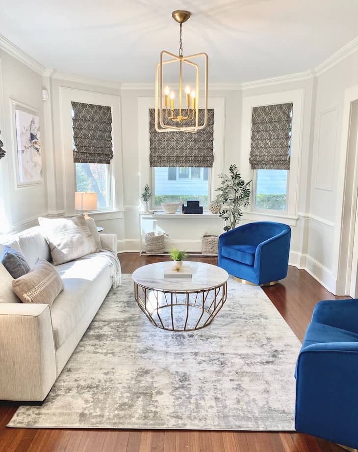 Introduce vibrant blue chairs to add energy and a clear focal point to the space. Balance the bold color with a neutral sofa, soft wall tones, and a light patterned rug. Finish with simple decor and warm metallic lighting to keep the room feeling elegant and well-coordinated.