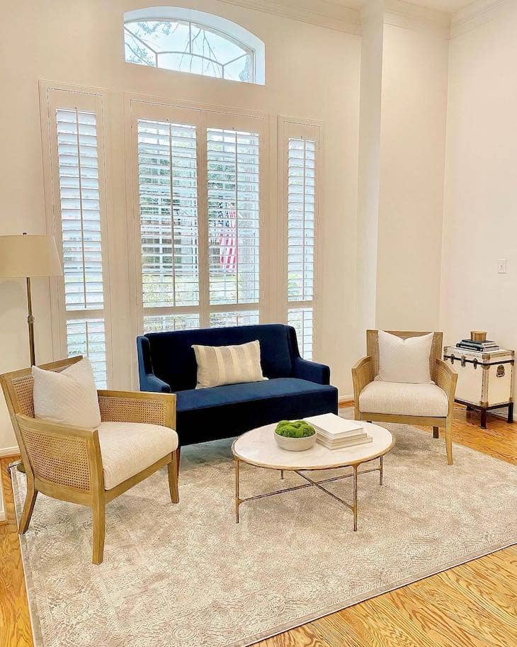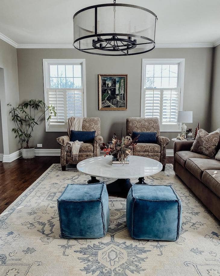 You can introduce color without changing your main furniture by placing two matching blue velvet ottomans in the center of the room. These versatile pieces provide a soft texture that contrasts beautifully against a light-colored, patterned rug. To tie the look together, place a few dark blue throw pillows on your existing chairs to create a balanced flow of color throughout the space.