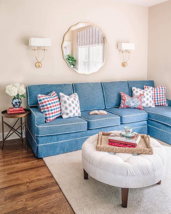 A denim-blue sectional provides a relaxed and comfortable base that works beautifully with classic red and white accents. You can easily achieve this charming look by layering pillows with different patterns, such as plaid and floral prints, to add personality to the seating area. To keep the room feeling bright, pair the blue fabric with a light-colored rug and a round white ottoman that serves as a soft coffee table.