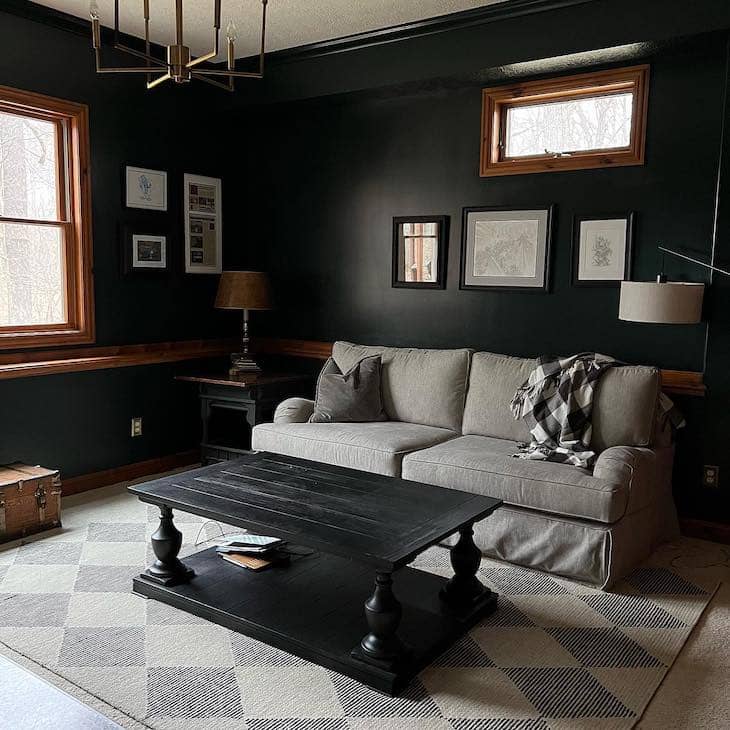 The dark green walls bring a rich, moody feel to the room while the light gray sofa brightens the space and keeps it comfortable. Wood trim and warm-toned decor add a rustic touch that blends beautifully with the darker backdrop. A black coffee table and simple artwork help tie the whole look together for a cozy, grounded atmosphere.