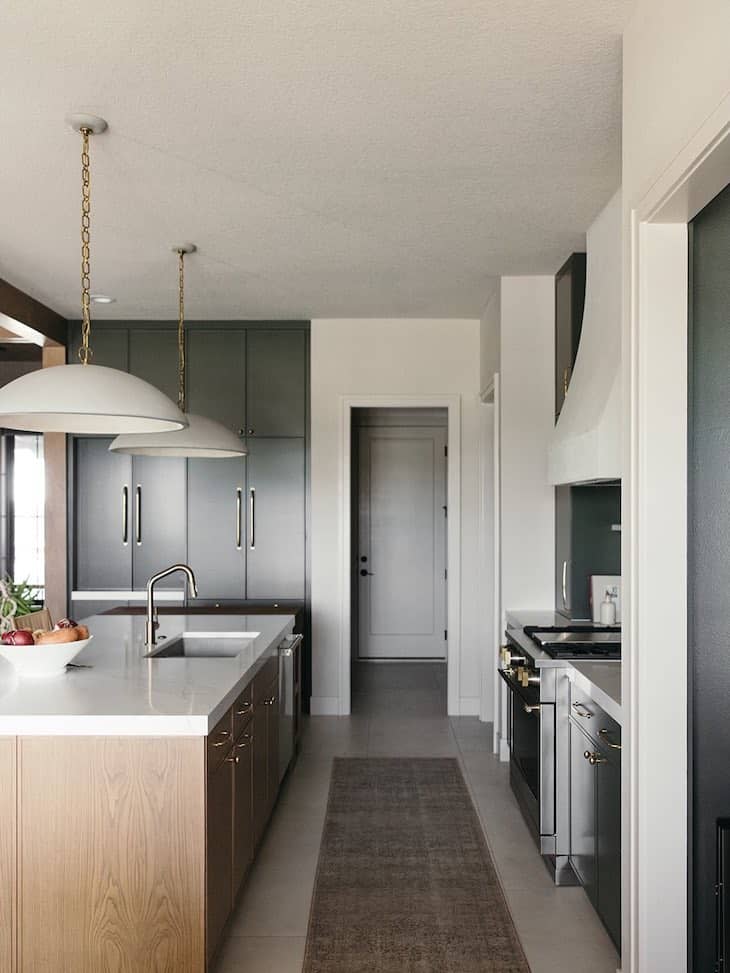 To make dark green kitchen cabinets truly stand out, pair them with a beautifully patterned runner that features deep reds and moody blues. Centering this richly colored rug on a sleek gray floor warms up the cool surface while easily tying the room’s natural color palette together. Finishing the space with bright brass hardware and a few lush indoor plants will perfectly complete this earthy, modern design.