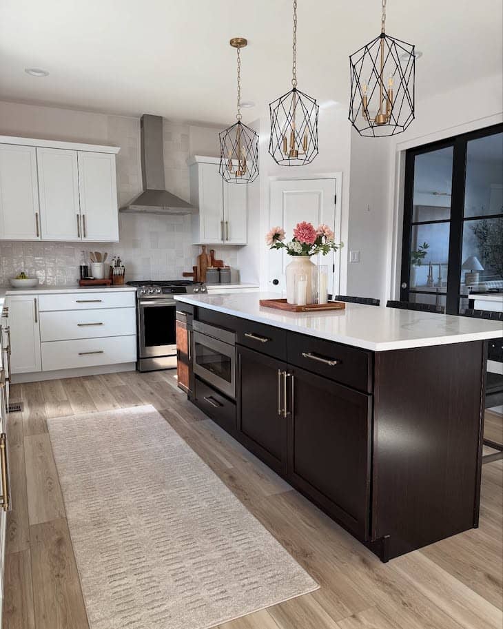 Balance a heavy, dark kitchen island by placing a light-colored, subtly textured runner right beside it. This gentle contrast breaks up the wood tones of the floor and prevents the deep cabinets from feeling too overwhelming in the space. Choosing a low-pile option with a simple pattern ensures the rug stays easy to clean while still adding a cozy layer to your cooking area.