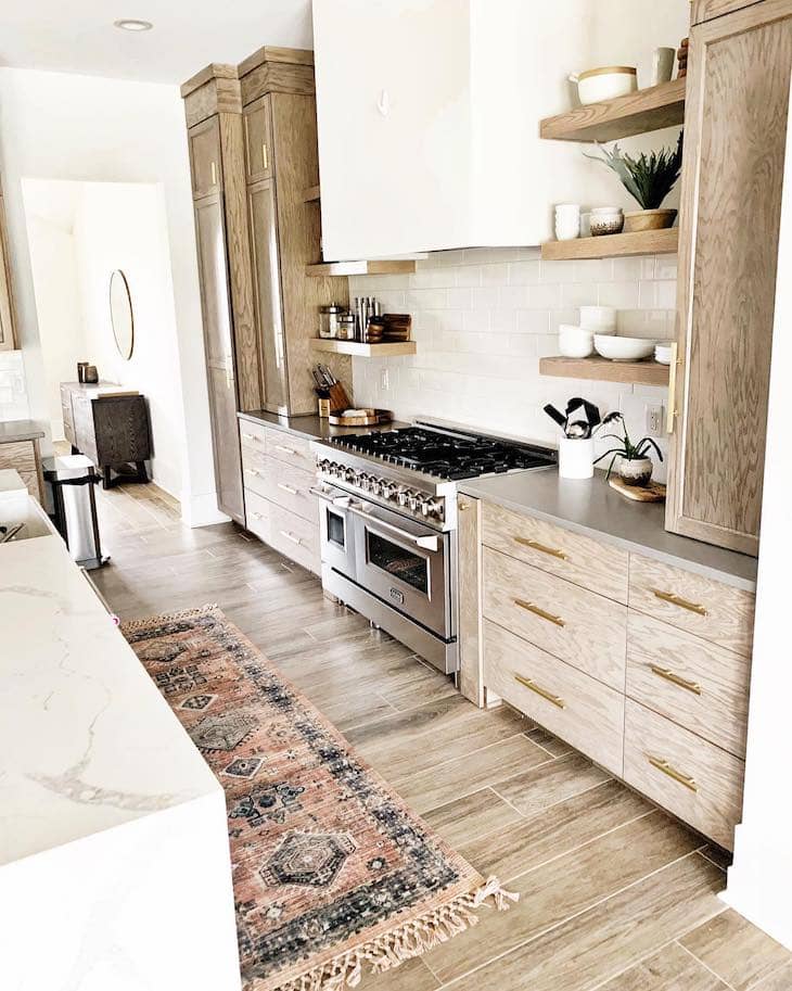 Enhance the beauty of natural wood cabinets by rolling out a soft beige runner with a delicate, vintage pattern. Keeping the rug’s colors light ensures the space feels open and bright without taking attention away from standout features like large metal pendant lights. You can easily create this cohesive look by matching the warm undertones of the rug to the natural grain of your floors and drawers.