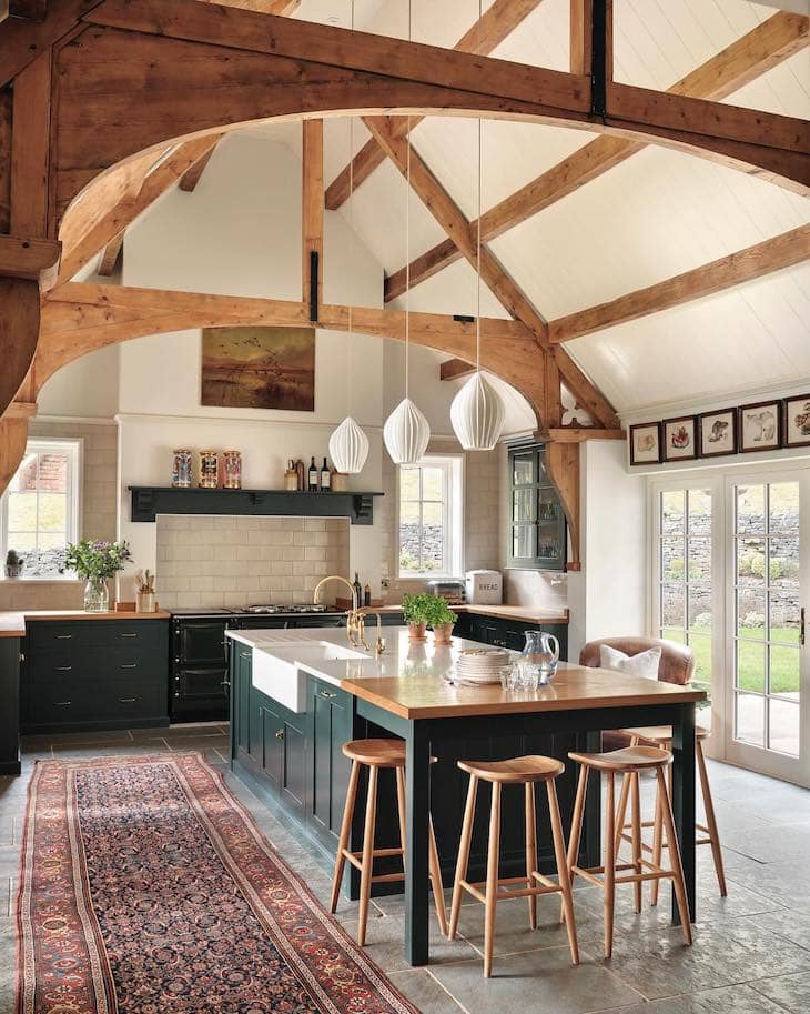 To make a large kitchen with high vaulted ceilings feel cozier, lay down a vibrant red runner rug on top of cool stone floors. Stretching a long, traditionally patterned rug next to your island beautifully balances the heavy rustic wooden beams above. You can easily complete this grand yet welcoming look by pairing the rich colors of the rug with warm wooden barstools and countertops.