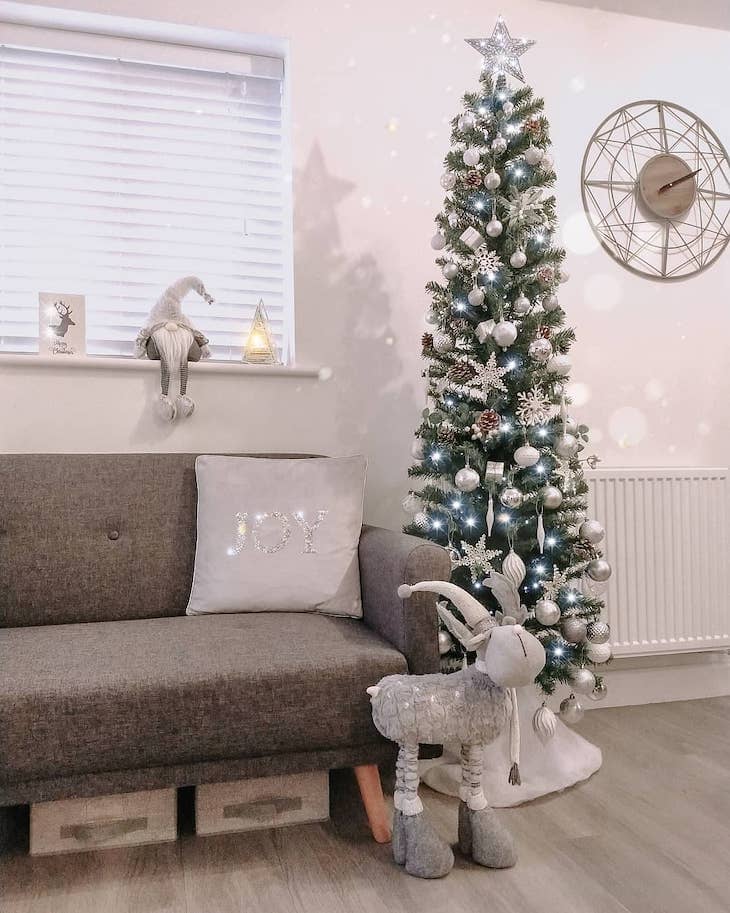This pencil Christmas tree shines with a classic silver and white theme, creating a fresh and elegant look. Shiny ornaments, snowflakes, and a glowing star topper keep the design simple yet festive. Pairing the tree with soft neutral decor like a “JOY” pillow and a cozy reindeer figure ties the space together beautifully.