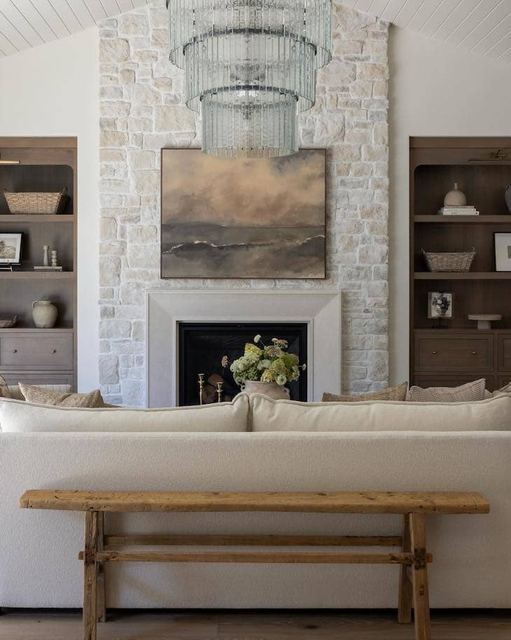 Mortar-smeared fieldstone in shades of cream and soft gray creates a textured, floor-to-ceiling focal point that beautifully grounds this serene living space. The rugged stone is balanced by a smooth, contemporary limestone surround and flanked by warm wood built-in shelving that offers both storage and a place for curated decor. Above the mantel, a large moody landscape painting and a grand glass tiered chandelier add layers of sophistication and light to the organic materials.