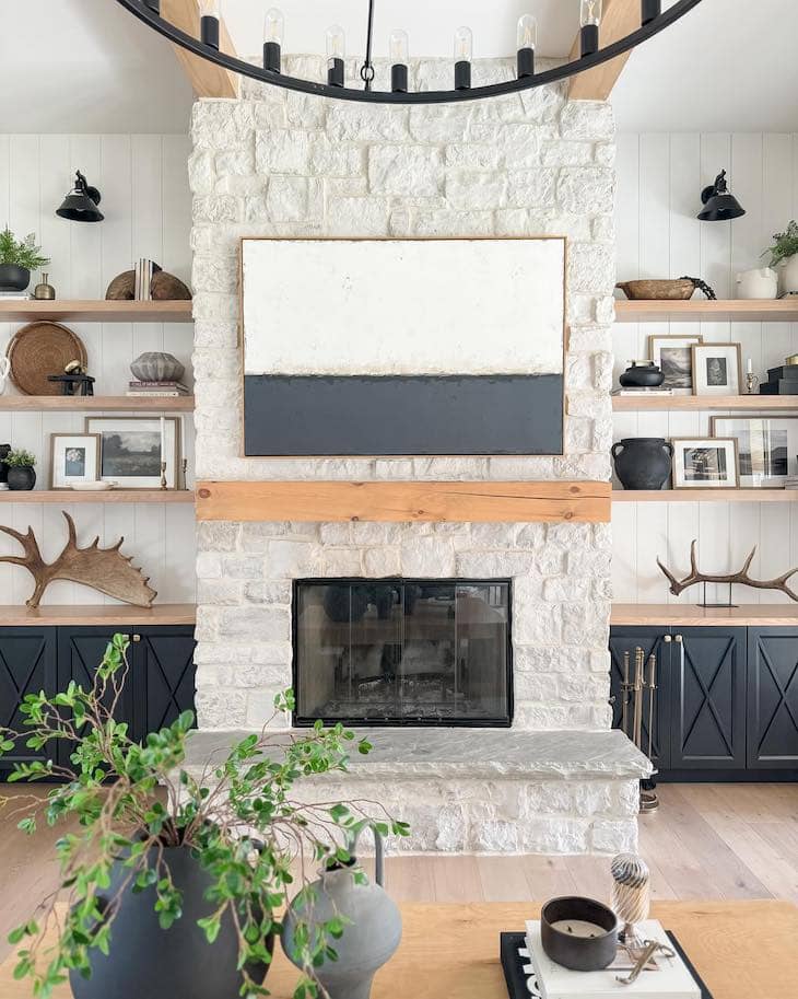 White cobblestones with heavy mortar create a rugged yet bright centerpiece that perfectly complements the surrounding shiplap walls and black cabinetry. A chunky, natural wood mantel adds a warm, rustic touch, providing a beautiful shelf for modern abstract art and tying in with the matching floating shelves. The low stone hearth and black-framed firebox complete the look, balancing the light textures with bold, dark accents for a contemporary farmhouse feel.