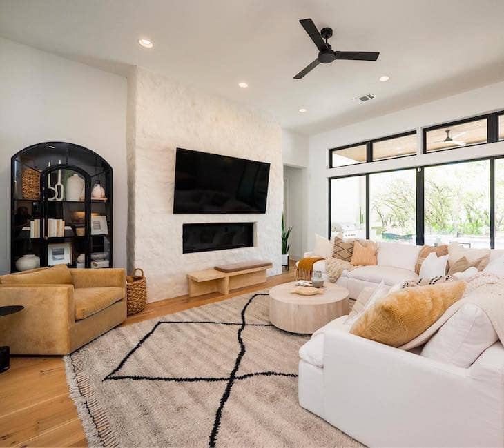 Heavily textured white stone creates a seamless, bright focal point in this airy living room, beautifully framing the modern linear firebox and sleek mounted television. A tall black arched display cabinet and dark window trims provide sharp, striking contrast against the pale masonry and crisp walls. Warmth is seamlessly introduced through a plush tan velvet armchair, light wood accents, and a cozy white sectional topped with earthy-toned pillows, balancing the contemporary aesthetic with inviting comfort.