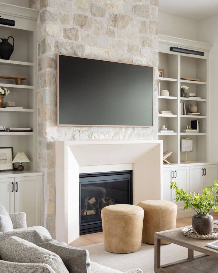 A blend of pale, roughly cut fieldstone forms a textured column that perfectly anchors the center of the living room. A sleek, angled cast stone surround frames the black firebox, offering a striking modern contrast to the rugged masonry and seamlessly integrating with the flanking custom white built-ins. Warmth is brought into the crisp space through a pair of tan leather poufs, a weathered wood coffee table, and subtle touches of natural greenery.
